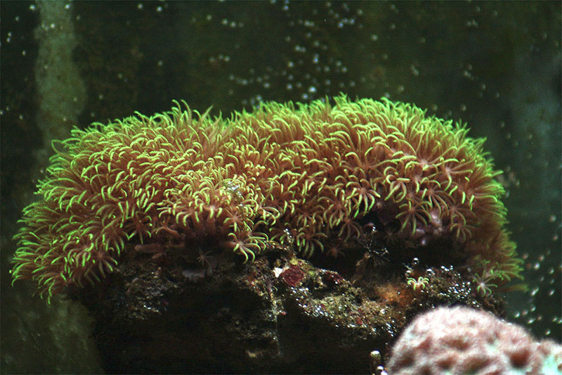 - die Polypen wachsen aus basalen Ausläufern, die eine violette Matte bilden, die das Substrat verkrusten