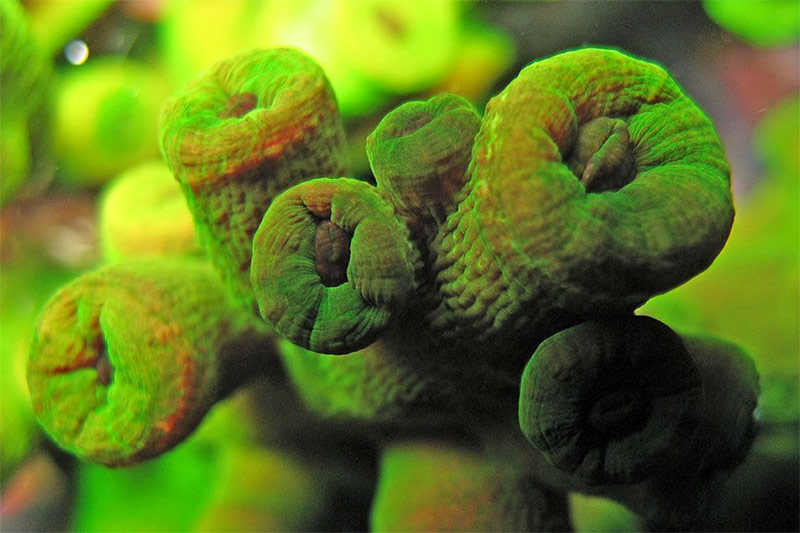 - ihre Grundfärbung der Korallenstöcke ist bräunlich bis schwarz-bräunlich, ihre Polypen sind heller gefärbt, oft fluoreszierend bräunlich-grün