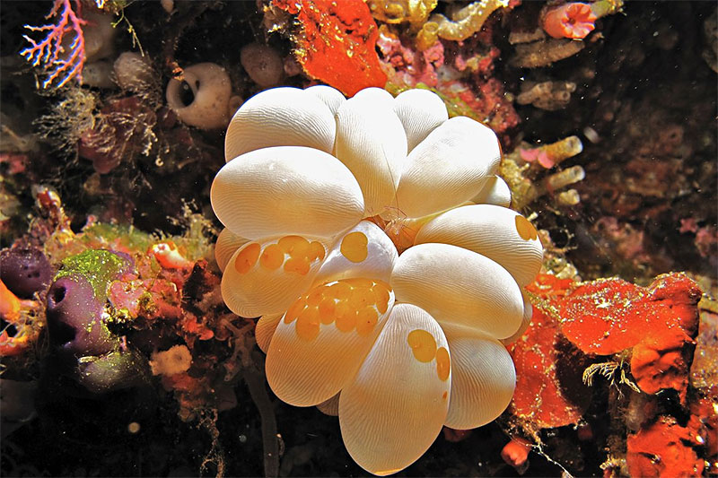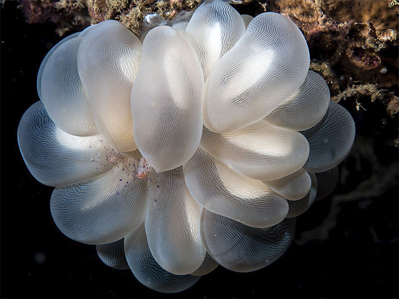 - tagsüber wird das Kalkskelett von zahlreichen Bläschen (Vesikeln) bedeckt. Diese ziehen sich jedoch während der Nacht zurück und es erscheinen mehrere Zentimeter lange Tentakel