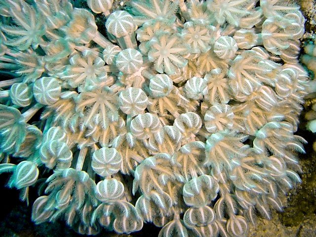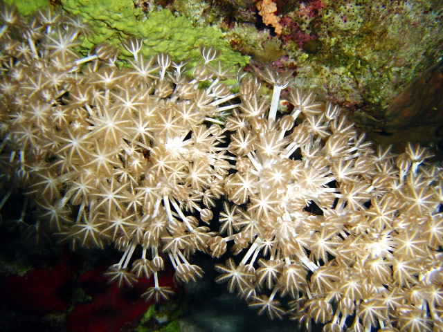 - die Polypen führen charakteristische Pumpbewegungen aus, durch die die Nährstoffe aus dem Wasser besser an alle Polypen verteilt werden und der Sauerstoff aus dem Korallengewebe abtransportiert wird