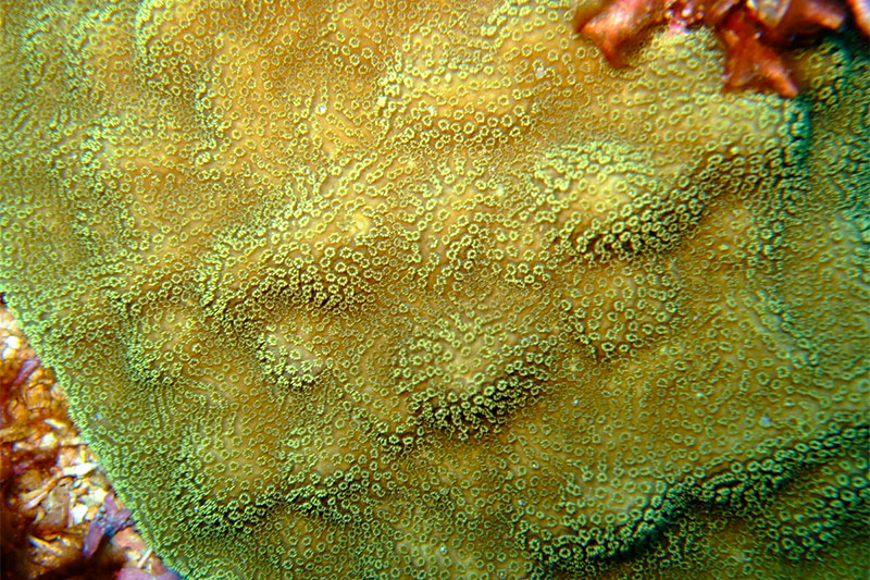- die Koralliten (Korallenkelche) sind klein und dicht gepackt und verleihen der Koralle ein poröses Aussehen