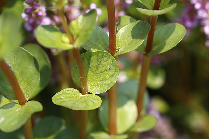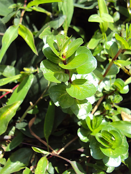 Die emerse (kriechende) Form der Rundblättrigen Rotala bildet rundliche Blätter (rotundifolia = rundblättrig).