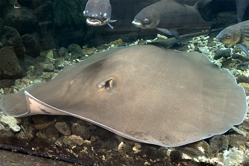 • der Schwanz des Riesen-Süßwasserstechrochens ist hinter dem Stachel schwarz