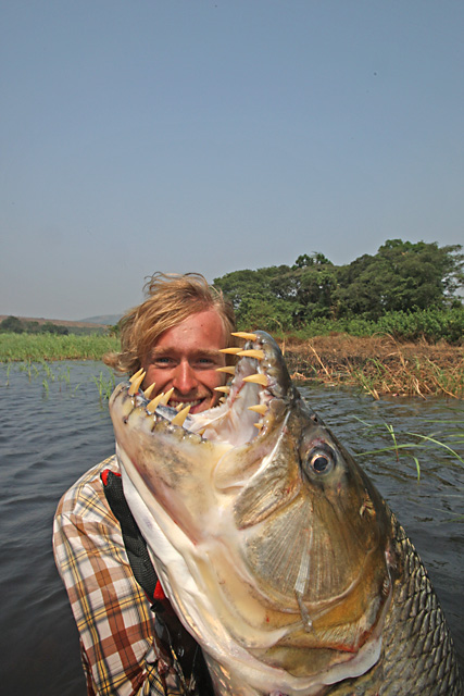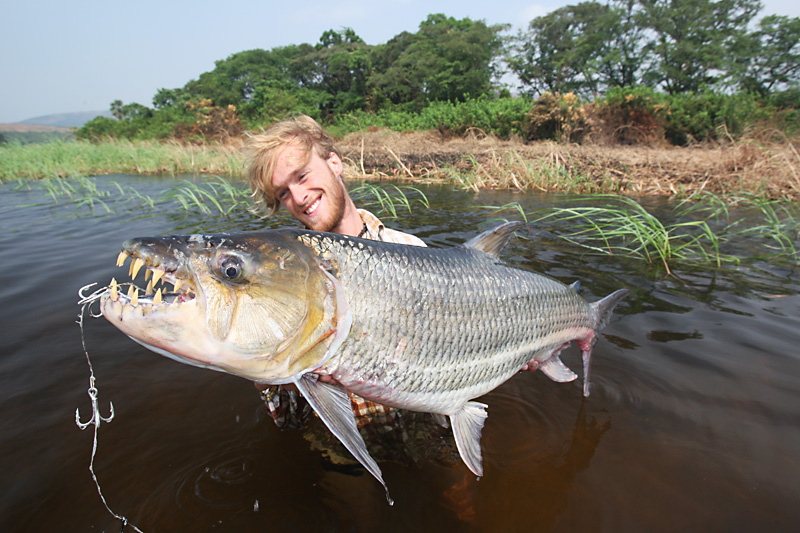 Aus dem treibenden Boot heraus fischen. Durch die knochigen und äußerst harten Kiefer des Riesen-Tigersalmlers gehen viele Fische beim Drill verloren, da der Haken nur schwer eindringt. Der Anbiss dieses Tigerfisches ist äußerst explosiv und meist unerwartet. Beim Drill springt der Riesen-Tigersalmler bis zu 2 m aus dem Wasser.