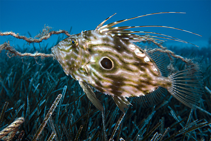 sich ein runder, schwarzer, oft gelb oder gelblichweiß umrandeter Fleck - auf seiner vorderen Rückenflosse befinden sich auffallend lange Stachelstrahlen, die nur im unteren Bereich