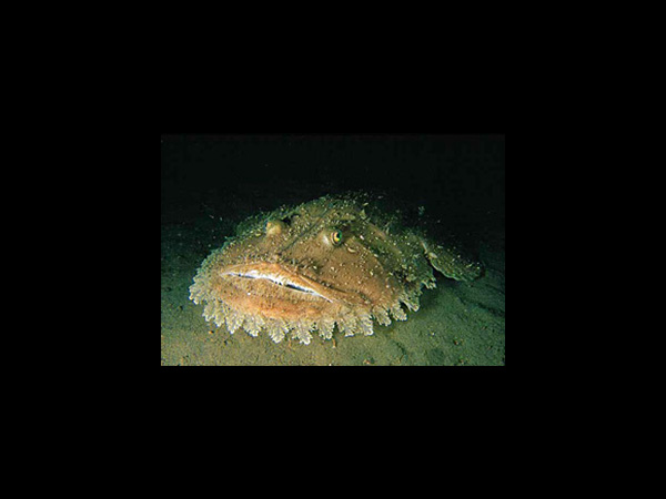 • er tarnt sich durch zahlreiche Hautanhänge an den Körperseiten, die ihn wie einen algenbewachsener Stein aussehen lassen