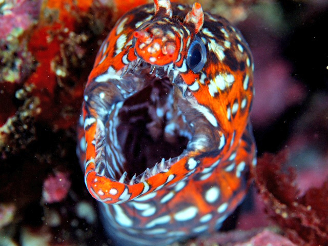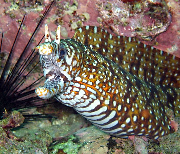 Die Drachenmuräne (Enchelycore pardalis) ernährt sich von kleinen Fischen.