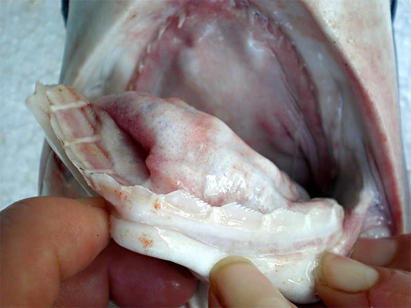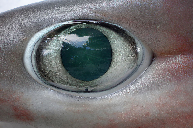 - die tiefe Maulspalte des Großaugen-Sechskiemerhais reicht bis weit hinter die Augen