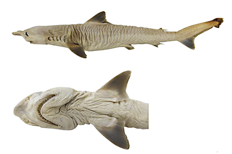 • die asymmetrische Schwanzflosse hat einen gut entwickelten unteren Lappen und einen längeren, schmalen oberen Lappen mit einer starken ventralen Kerbe nahe der Spitze