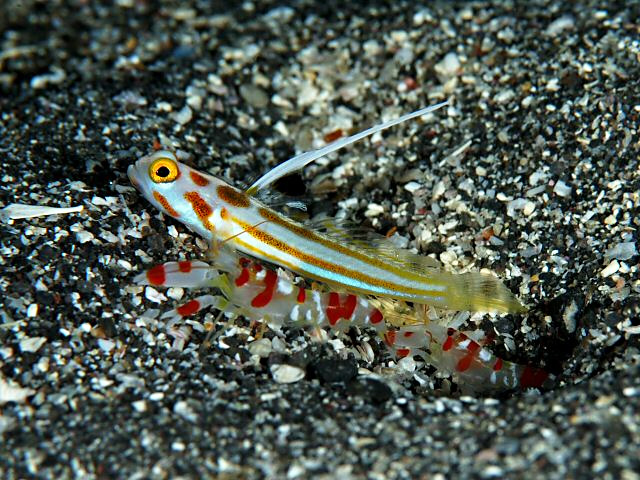Die Grundel bewacht den Höhleneingang und signalisiert durch ihr Verhalten dem Knallkrebs, dass es draußen sicher ist. Sollten Räuber in der Nähe sein, erfolgt dieses Signal nicht. Kommt der Räuber zu nahe, versteckt sich die Grundel in der Höhle.