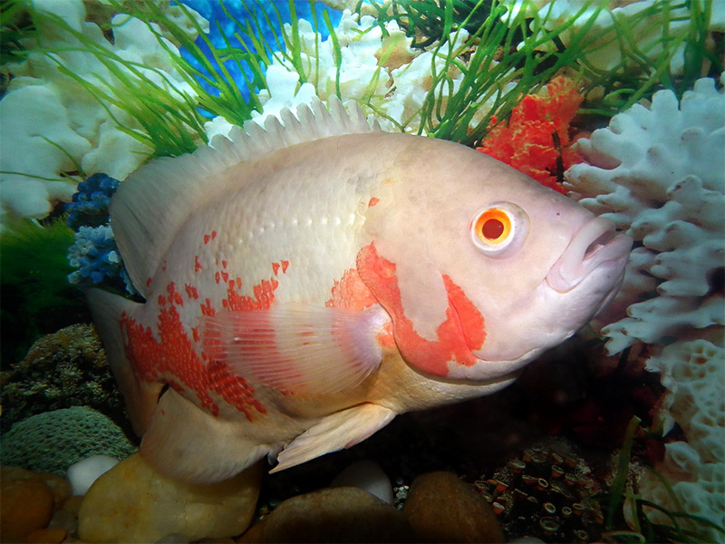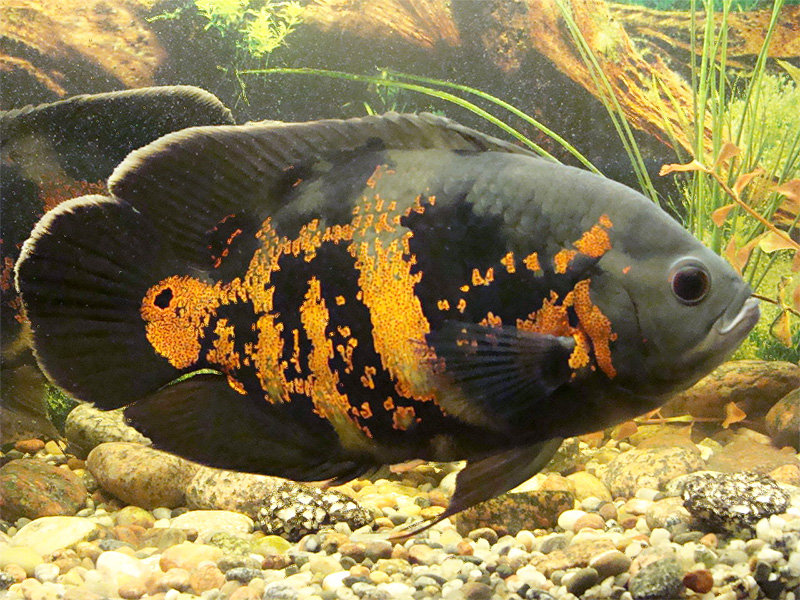 Der Pfauenaugenbuntbarsch (Astronotus ocellatus) ernährt sich in freier Natur hauptsächlich von Schnecken, kleinen Fischen, großen Insektenlarven und Krebstieren.