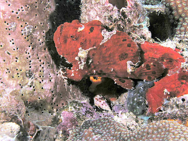 Der Ozellen-Anglerfisch (Fowlerichthys ocellatus) ernährt sich hauptsächlich von Fischen und Garnelen.