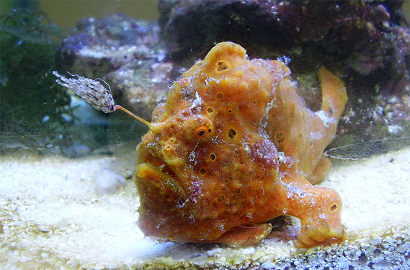 Der Gemalte Anglerfisch (Antennarius pictus) ernährt sich in freier Natur hauptsächlich von Fischen. Diese saugt er blitzschnell in sein riesiges Maul ein.