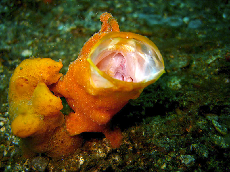 • juvenile Gemalte Anglerfische imitieren die Färbung giftiger Hinterkiemerschnecken (Nudibranchia)