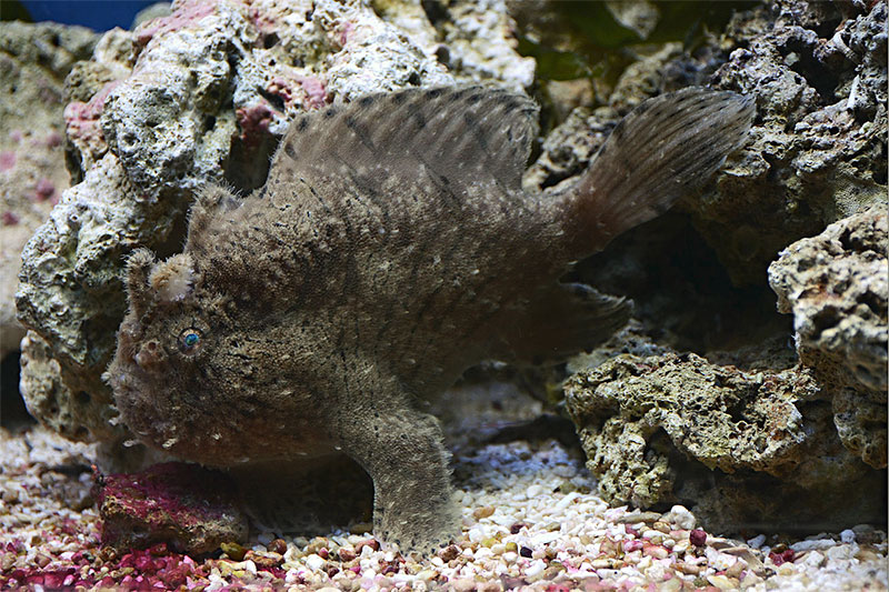 - die Grundfärbung des Hispid-Anglerfisches variiert von dunkelbräunlich über ockerfarben bis gelblich