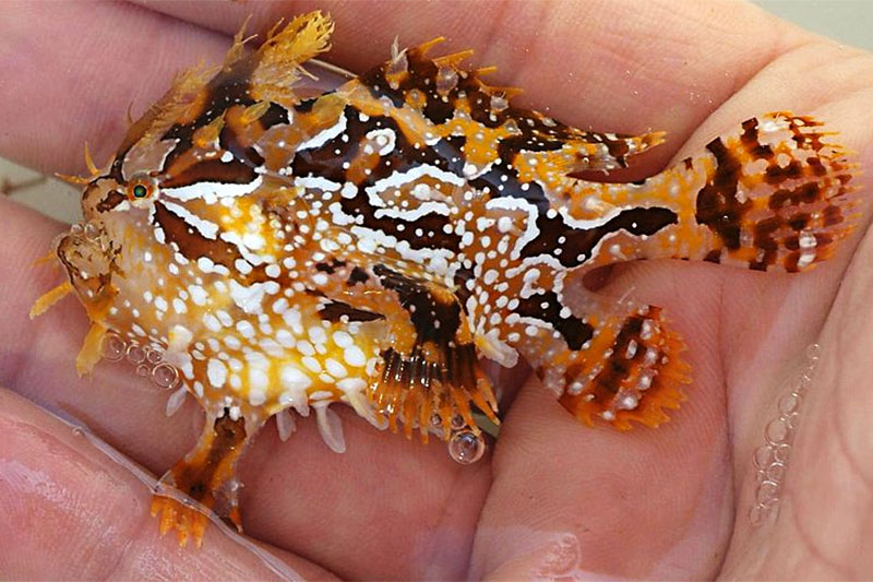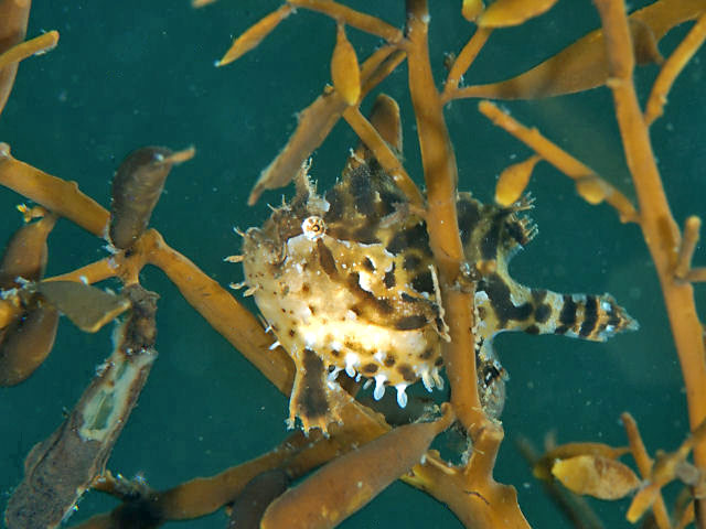 • die Grundfärbung des Sargassofisches ist hellbraun und mit zahlreichen ockerfarbenen bis dunkelbraunen Flecken oder Strichen bedeckt, die oftmals weißlich umrandet sind