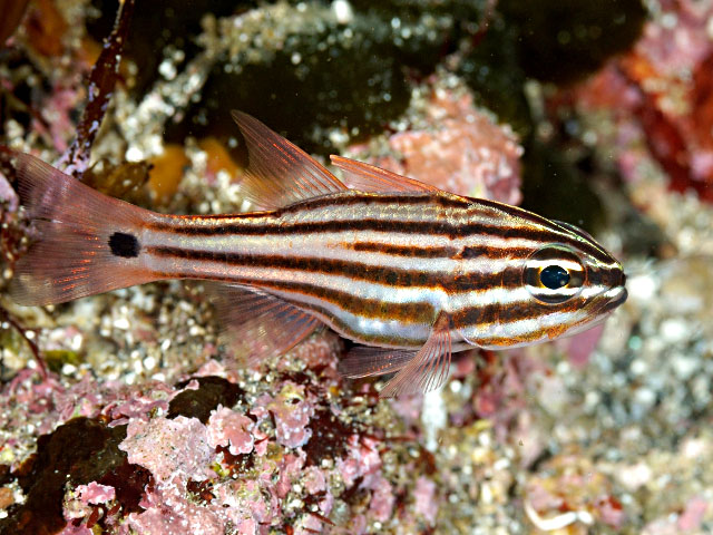 Ostorhinchus endekataenia wird maximal ca. 14 cm lang.