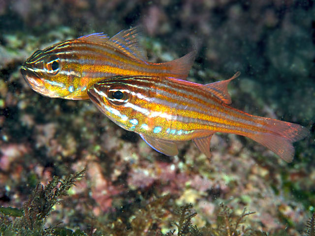 Ostorhinchus holotaenia wird maximal ca. 8 cm lang.