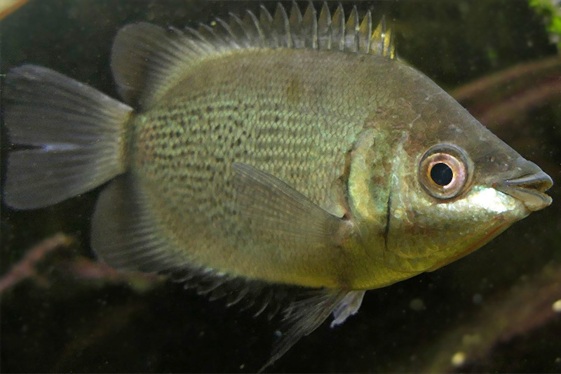 • die Wildform des Küssenden Gurami ist silbrig-grünlich gefärbt und zeigt auf den Körperflanken zahlreiche schmale Längsstreifen. Der Schwanzflossenstiel ist mit einem dunklen Ring eingefasst, die Flossenmembranen farblos