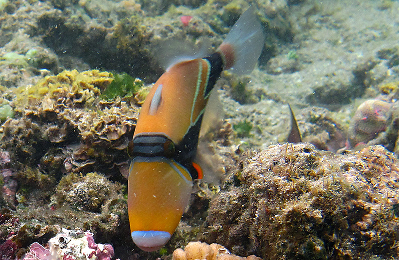- wie alle Drückerfische kann auch diese Art durch den 2. Rückenstachel den 1. Rückenstachel aufrecht fixieren. Damit klemmt er sich in Felsspalten oder Korallen fest