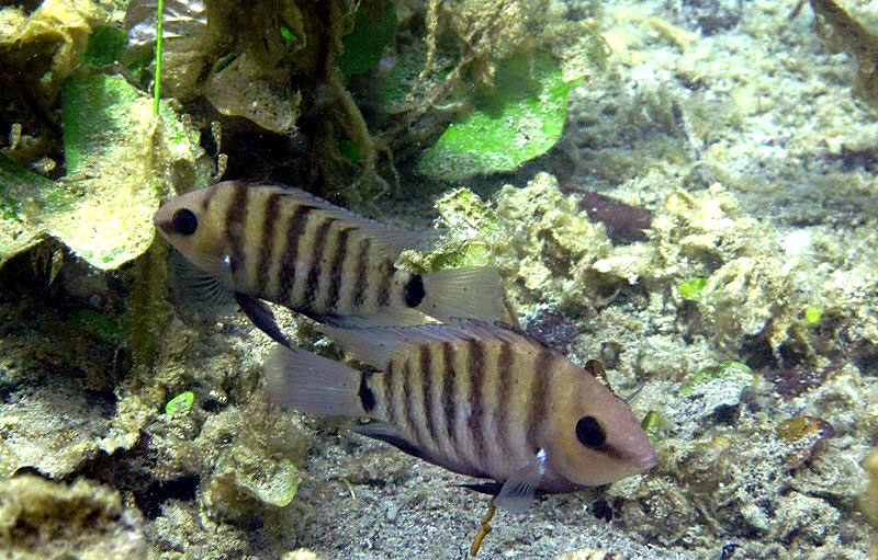 - auf den Körperflanken von Cryptoheros chetumalensis verlaufen 7 dunkle Querbänder, die manchmal nur teilweise sichtbar sind. Das 3. Band von vorne zeichnet sich oft breiter und kontrastreicher ab als die anderen und zieht sich bis in die Rückenflosse hinein