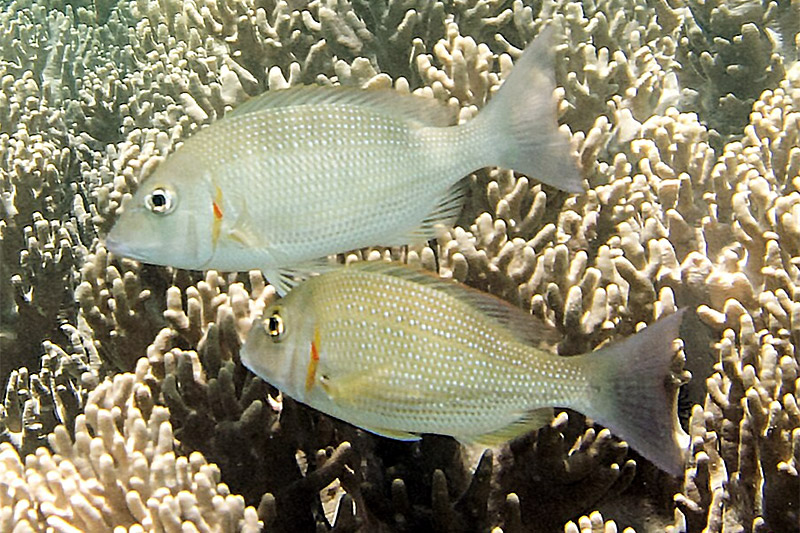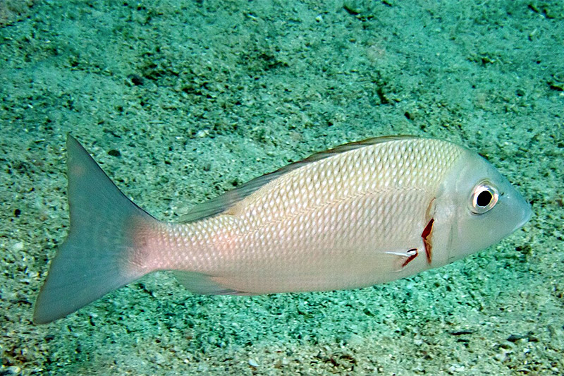 • Lethrinus lentjan ist olivgrün gefärbt und zeigt manchmal einen bläulichen Schimmer