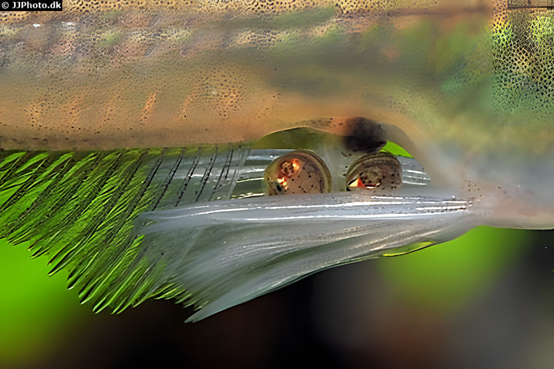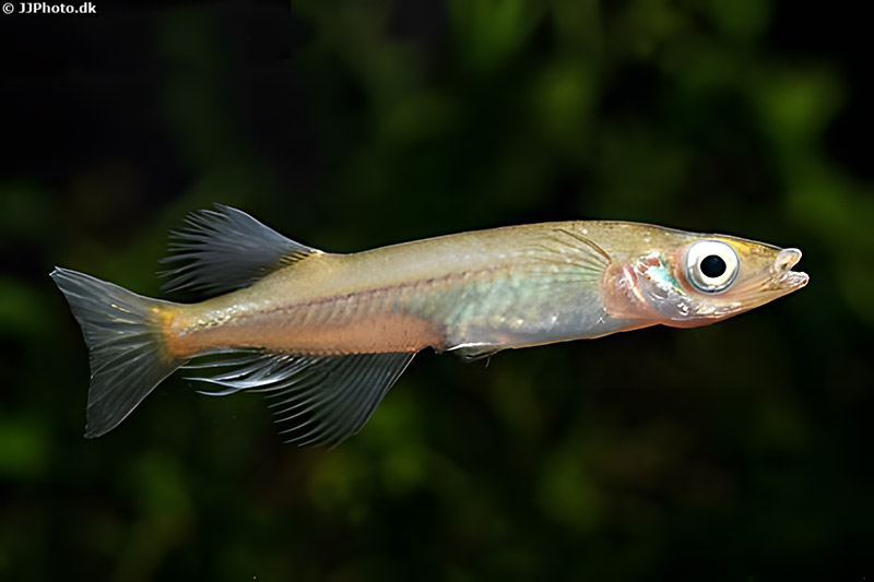 - sein Maul ist oberständig (der Oberkiefer ist etwas länger). Dies ist typisch für Fische, die ihre Nahrung bevorzugt nahe der Wasseroberfläche aufnehmen